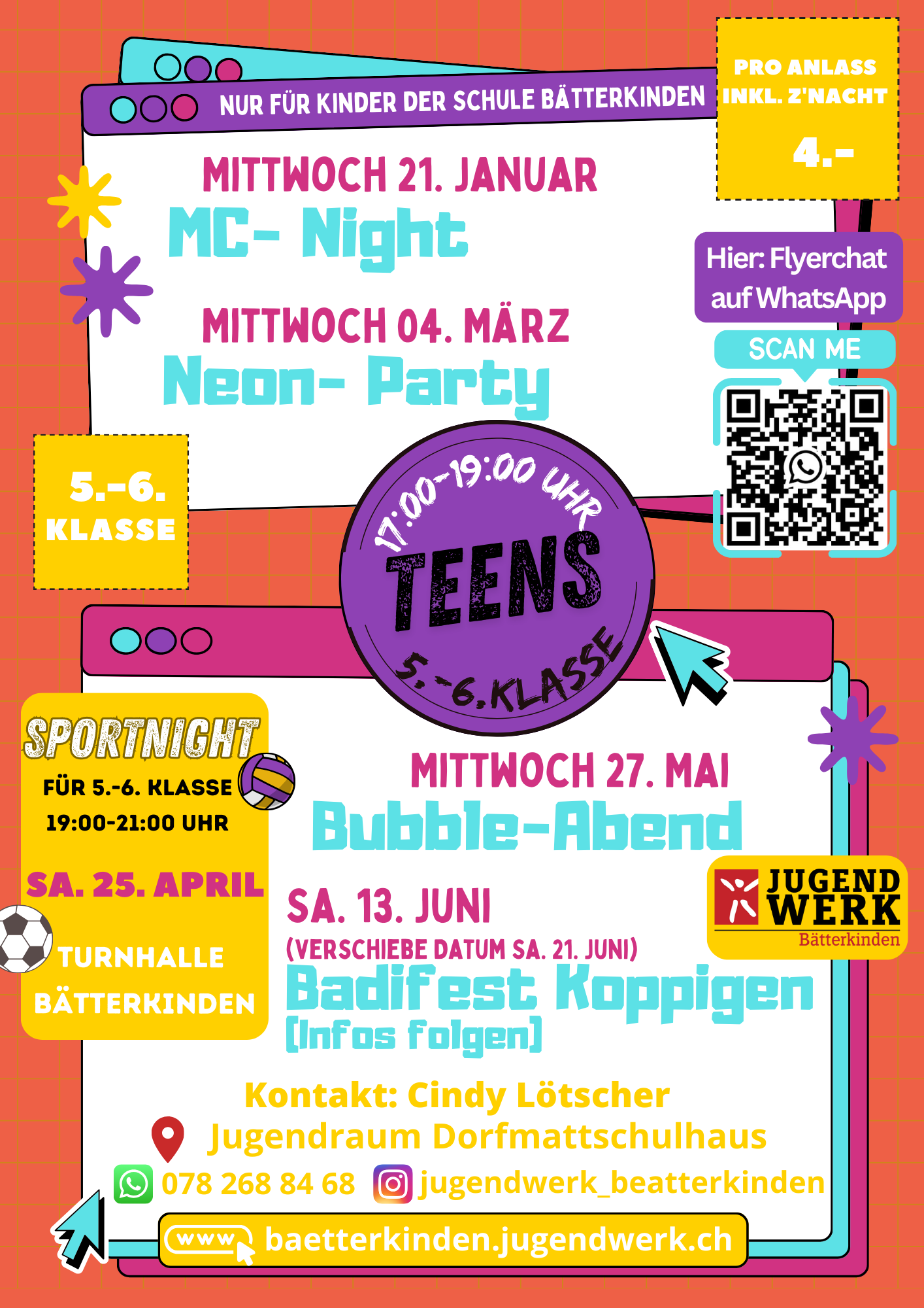 Der Teens-Treff richtet sich an alle Kinder und Jugendlichen der 5. & 6. Klasse. Das Angebot findet ca. alle zwei Monate am Mittwochabend im Jugendwerk statt und dauert von 17.00 bis 19.00 Uhr. Bitte CHF 4.- für die Verpflegung mitbringen.