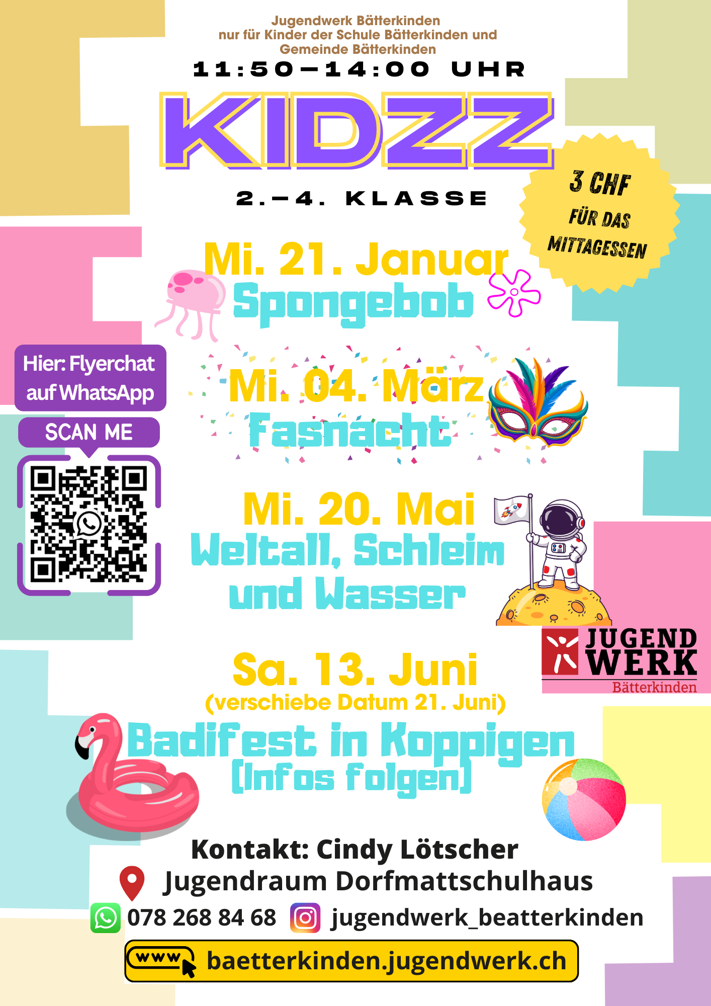 Das KIDZZ ist ein Angebot für alle Schüler*innen der 2. - 4. Klasse und findet am Mittwochmittag von 11.50 – 14.00 Uhr in den neuen Räumlichkeiten des Jugendwerks (Dorfmattschulhaus) statt. Im KIDZZ gibt es ein leckeres Zmittag und danach ein wechselndes Programm, passend zum jeweiligen Thema. Im Zentrum stehen Spiel, Spass und Kreativität. Bitte 3 CHf gür die Verpflegung mitbringen.