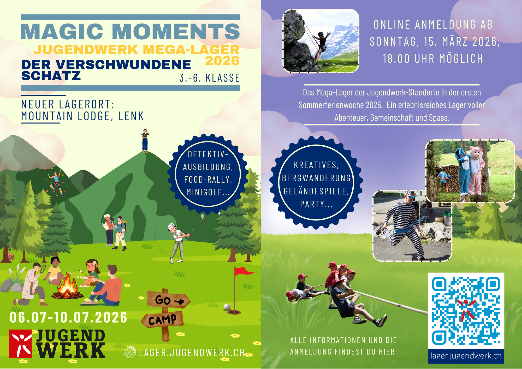 In der ersten Sommerferienwoche organisiert das Jugendwerk das Mega-Lager "Magic Moments". Gemeinsam wollen wir in der Lagerwoche den verschwundenen Schatz wieder finden! Neben einer Detektiv:innenausbildung warten abenteuerliche Programmpunkte wie Geländespiele, eine Food-Rally, Bergwanderung oder die grosse Abschlussparty auf dich. Weitere Informationen zum Lager sowie das Anmeldeformular findest du unter lager.jugendwerk.ch Anmelden kannst du dich ab Sonntag, 15. März, 18.00 Uhr. Um dir sicher einen Platz im Lager schnappen zu können, empfehlen wir eine rasche Anmeldung – im letzten Jahr waren nach 45 Minuten alle Plätze ausgebucht.